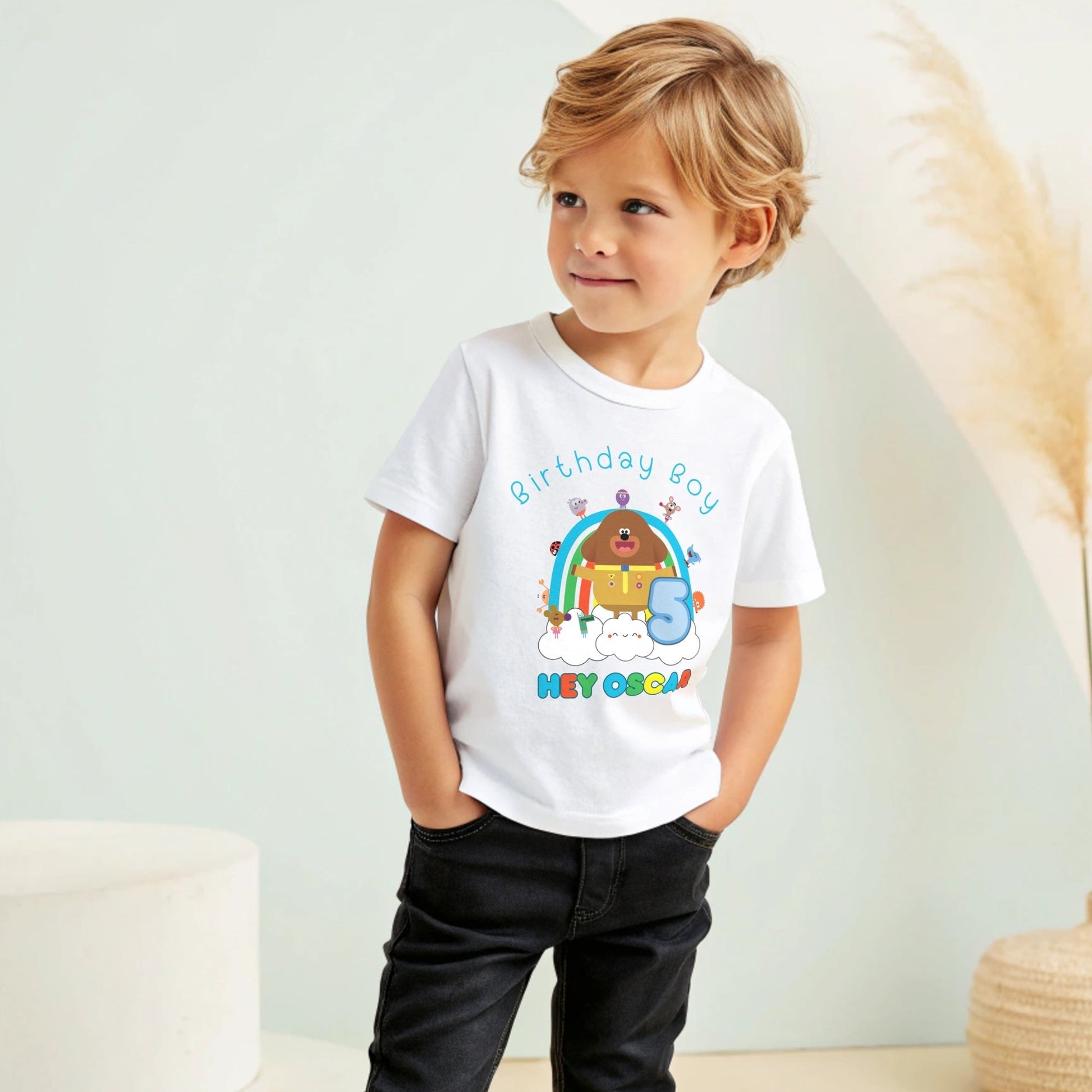 Make your little boy's special day truly memorable with a personalised Hey Duggee birthday t-shirt, crafted to be as unique as he is! This adorable Hey Duggee birthday t-shirt features the beloved character from the popular children's show, allowing you to customise it with your child's name and age. It's the perfect keepsake that he'll cherish for years to come. Constructed from high-quality materials, this Hey Duggee birthday t-shirt offers both comfort and durability, making it ideal for a busy Duggee birthday celebration. With its vibrant colours and eye-catching design, your child will be thrilled to showcase their favourite character, Hey Duggee and the Squirrels on their birthday t-shirt.