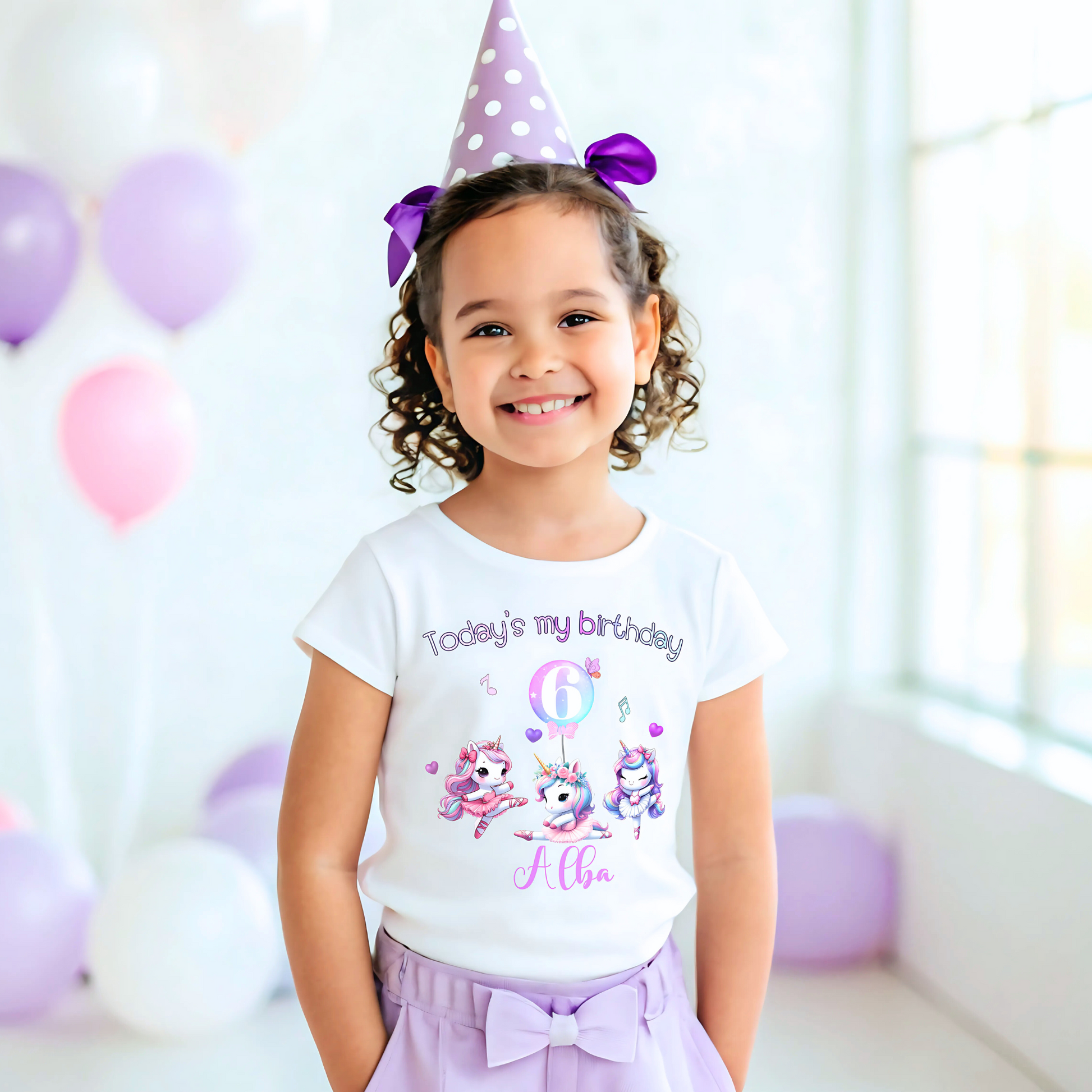 Celebrate your little one's special day with our charming and trendy Girls Unicorn Birthday T-Shirt in delightful pastel pink and lilac hues! This enchanting unicorn birthday t-shirt is designed specifically for girls and toddlers, making it the perfect choice for your little dancer to sparkle on her birthday. Crafted from soft, breathable 100% cotton, this unicorn birthday t-shirt not only adds a magical touch to her celebration but also ensures comfort while she twirls and plays. Customise the unicorn birthday t-shirt with her name for a truly unique gift that she’ll cherish forever. Bring the magic of unicorns to her special day and let her dance in style!