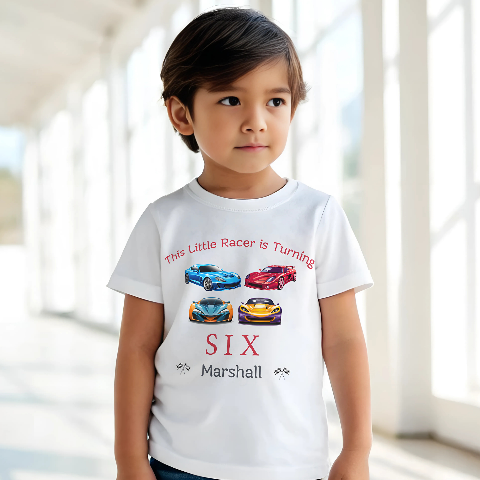 Personalised Boys Little Racer Birthday T-Shirt - Racing Car Shirt with Any Name and Age
